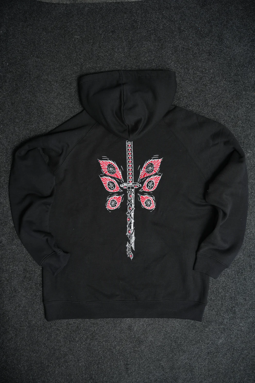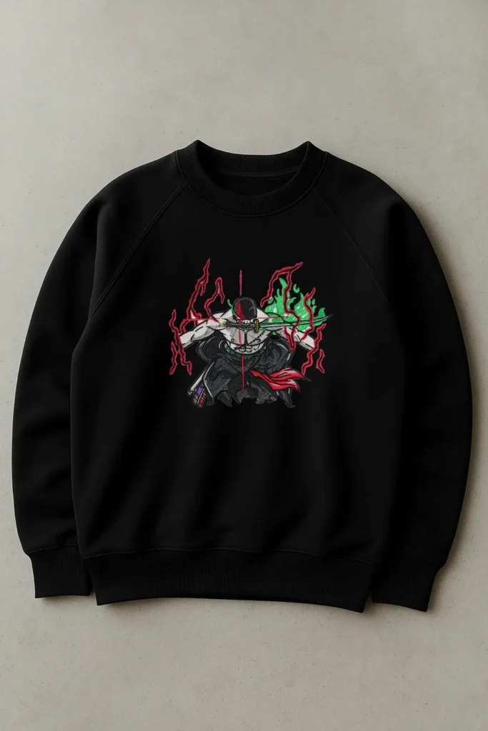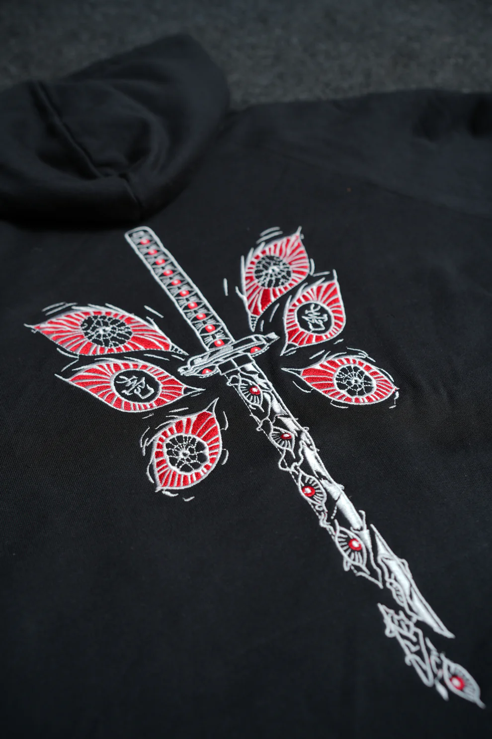 🔹 Details: High-density embroidery for the blade’s intricate waves, layered threadwork to capture metallic sheen, and fine detailing for the earring’s symbolic design.