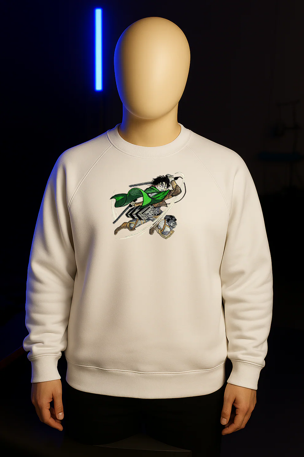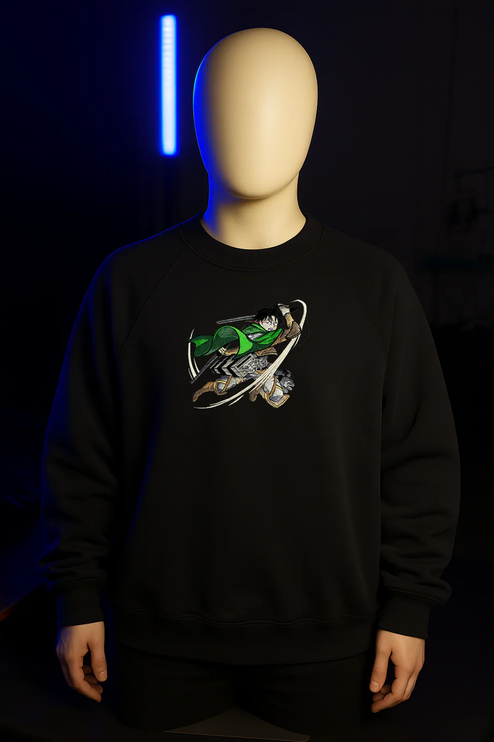 A moment frozen in motion — the silent fury of Levi Ackerman captured mid-strike. The embroidery carves through fabric like his blade through the chaos, embodying his precision, discipline, and wrath restrained by purpose. A symbol of calm destruction and perfect control.